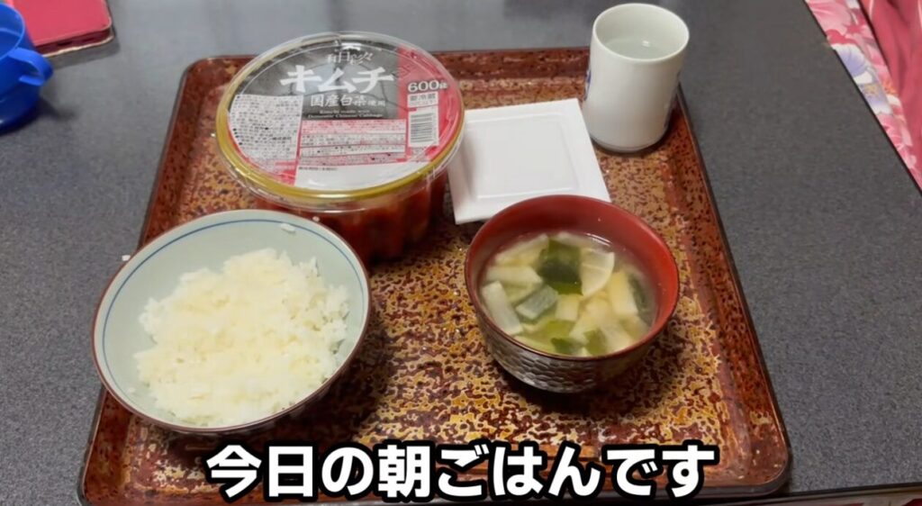 今日の朝ごはんは、ご飯、味噌汁、キムチ、納豆、生卵、水です。