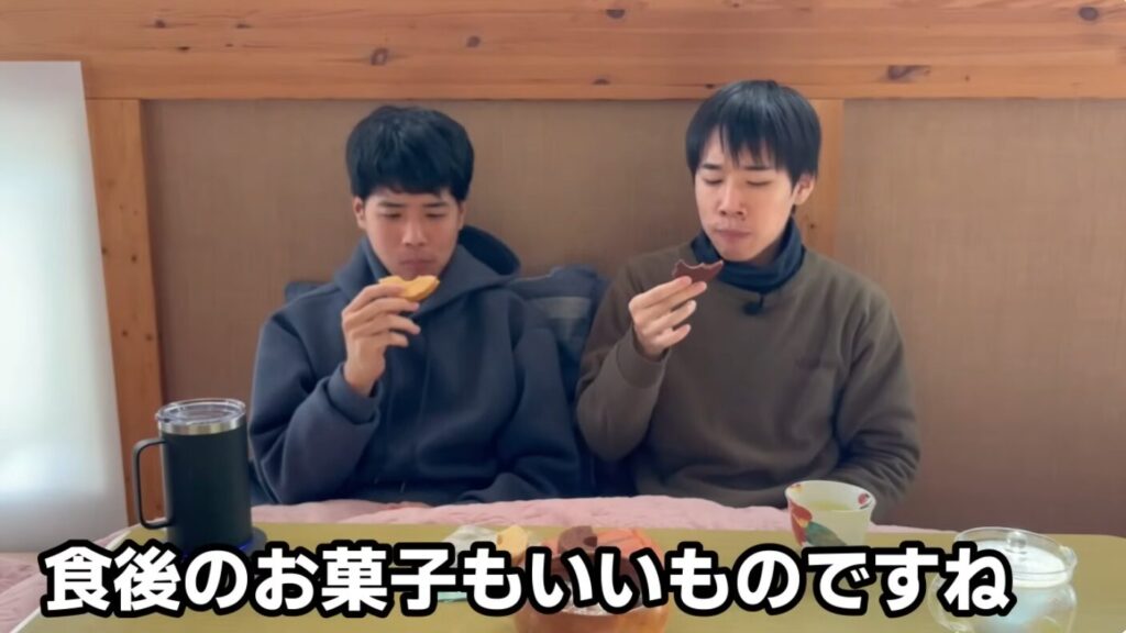 食後は、TEMUで購入した保温機能付きコーヒーマグセットでお茶を飲みながら、バウムクーヘンを半分ずつ分けて食べました。