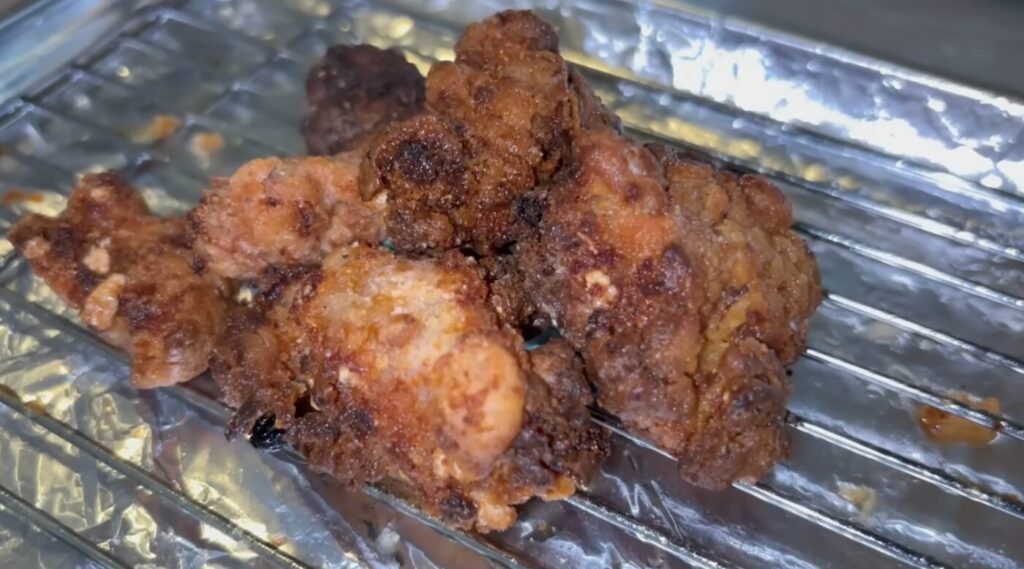 低温でじっくり火を通してから高温で仕上げる方法で、外はザクザク、中は柔らかい唐揚げが完成しました。