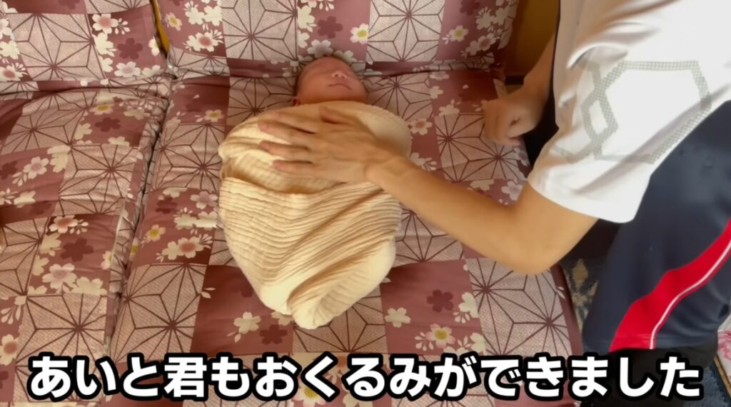 ママに教わったおくるみを使って、不格好ながらも何とか包むことができました。