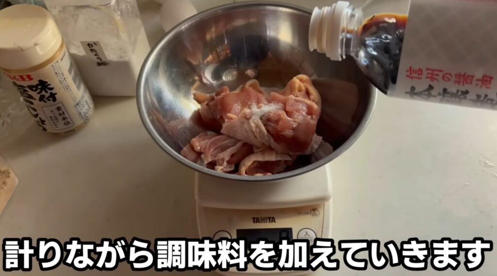 片栗粉を勢いよく落とすのが好きで、鶏肉によく粉をまとわせました。