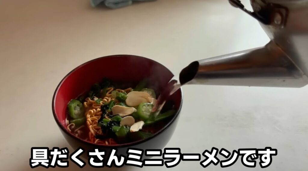 熱湯を注いで、具だくさんミニラーメンの完成です。