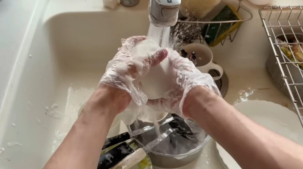 肌荒れが痛いので、ビニール手袋をして作業します。
