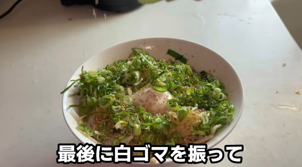 たっぷりのネギは期限が切れるので使い切って、最後に白ゴマを振って完成です。