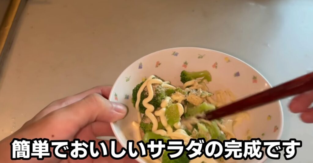 解凍した冷凍ブロッコリーに粉末だしをふりかけて、マヨネーズと和えるだけ。シンプルなのに旨みがしっかり乗って、これが本当においしかったです。カニ風味かまぼこも添えて、見た目もにぎやかになりました。