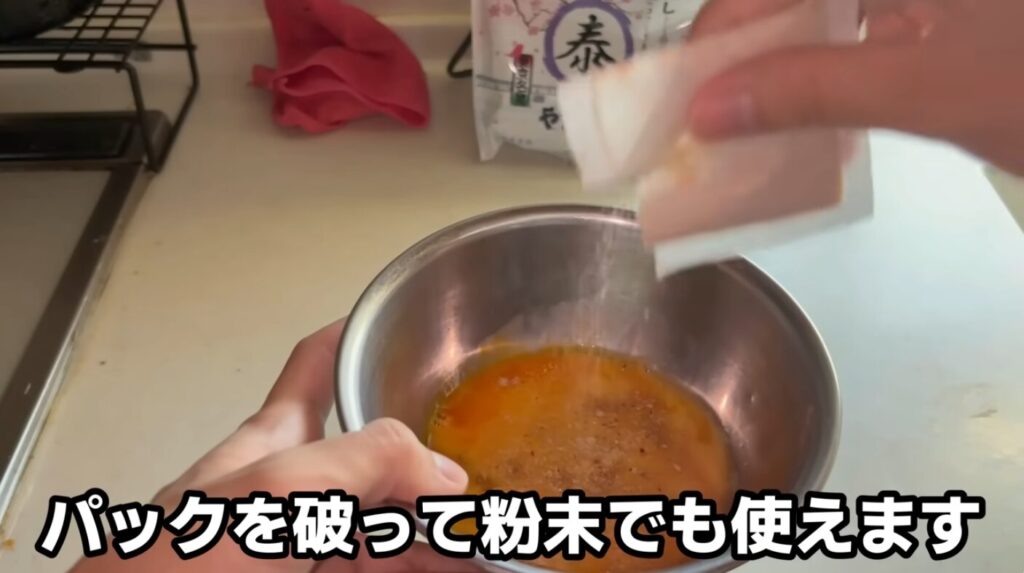 鰹節と昆布の旨みが詰まったパックを破って粉末にして、醤油と砂糖と合わせて卵液を作ります。卵料理はまだ上手とはいえないですが、作っていると楽しくて好きです。最後まで丁寧に巻いてひと口サイズにカットすると、おいしそうに仕上がりました。