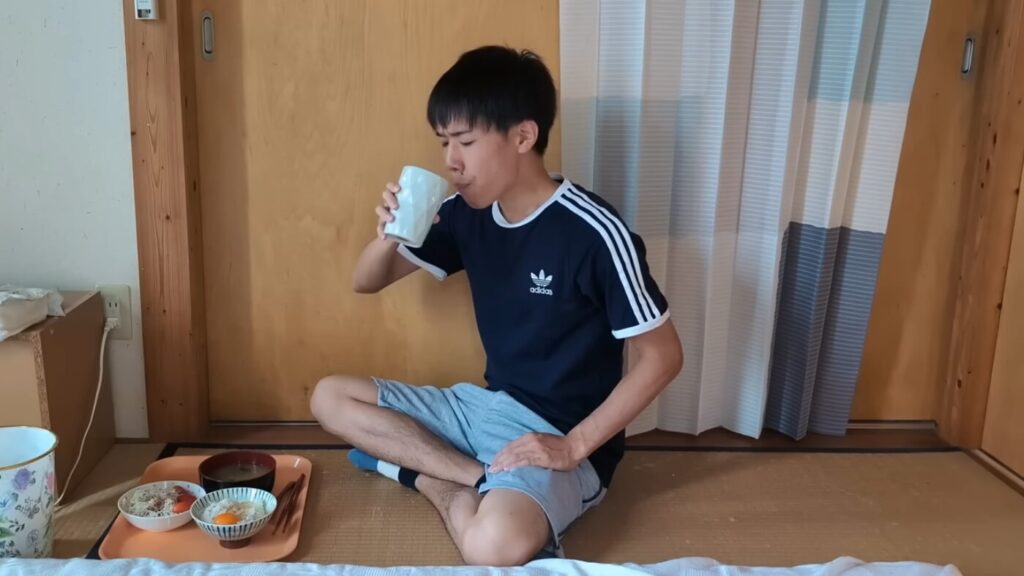 今日のメニューは、卵かけごはん・なめこの味噌汁・カットキャベツのサラダ・豆乳というシンプルな構成。