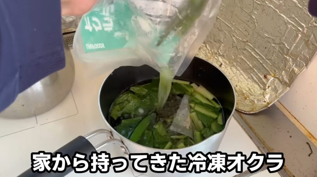 味噌はもらいものの自家製味噌を使いました。火を止めてからしっかり溶かして、乾燥わかめと冷凍オクラを加えれば完成です。