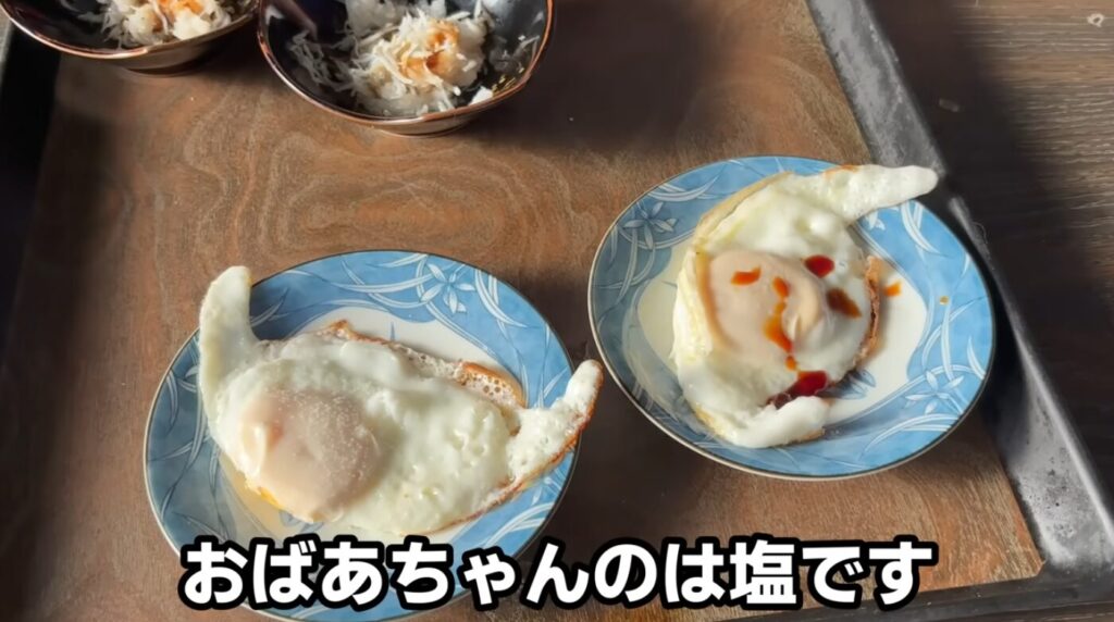 目玉焼きはおばあちゃん用には塩、自分用には醤油と味付けを変えました。