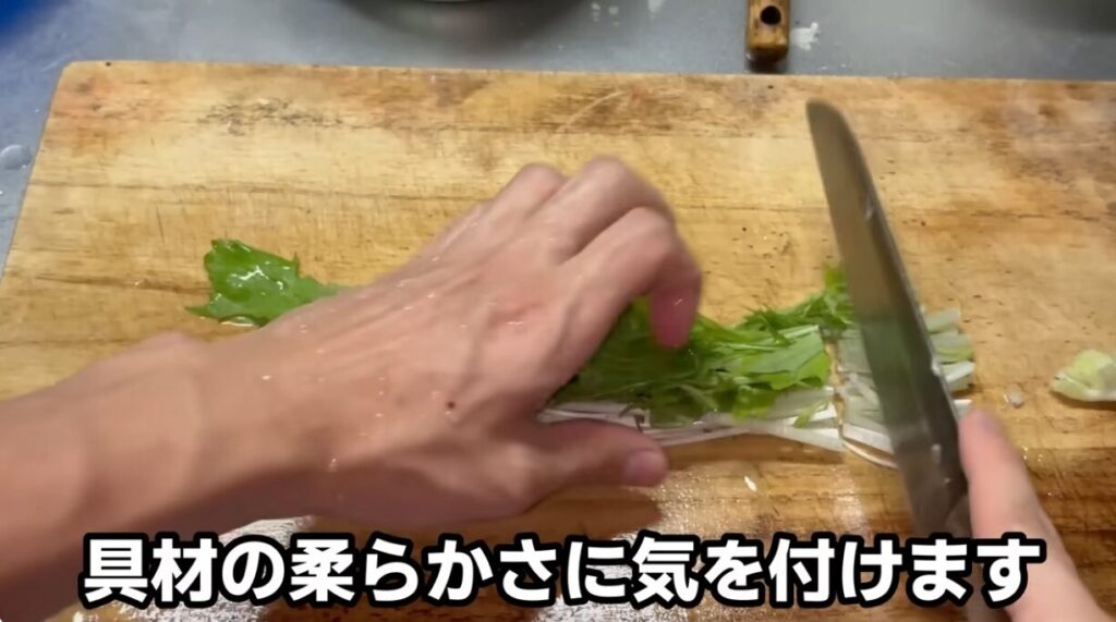 水菜やわかめもしっかり煮込んで、食べやすくします