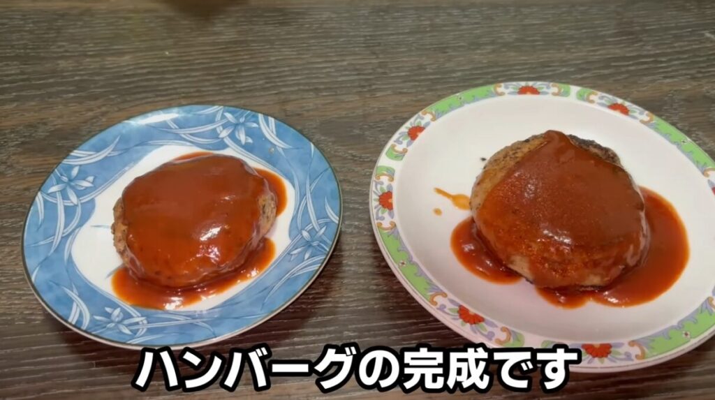 焼き上がったハンバーグにお手製のソースをたっぷりかけて、これで完成です!