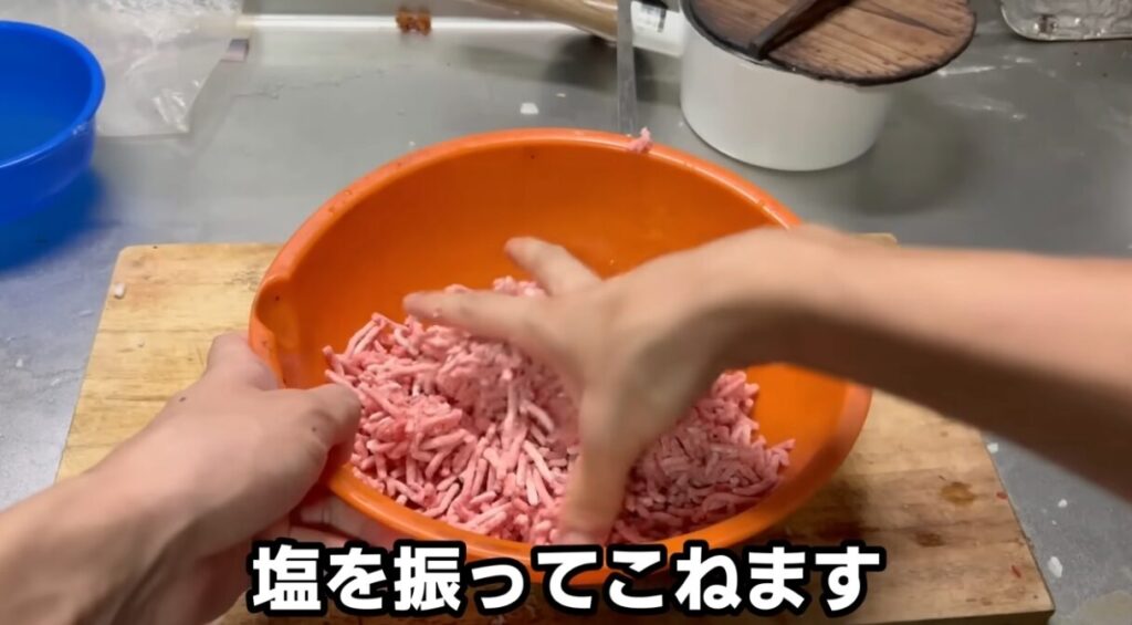 ひき肉をボウルに入れ、塩を振ってよくこねます。