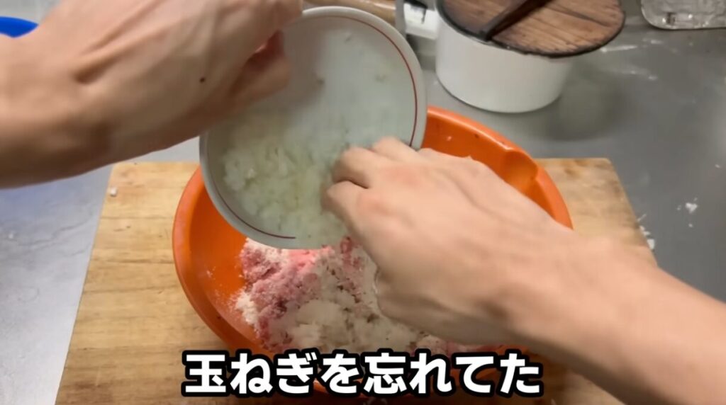 パン粉、牛乳、卵、胡椒を加えてさらにこねたら、加熱しておいた玉ねぎも混ぜます。