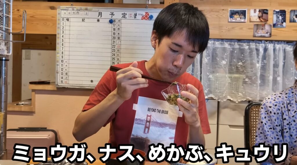 ミョウガ、ナス、めかぶ、キュウリ、シソが入っていました。