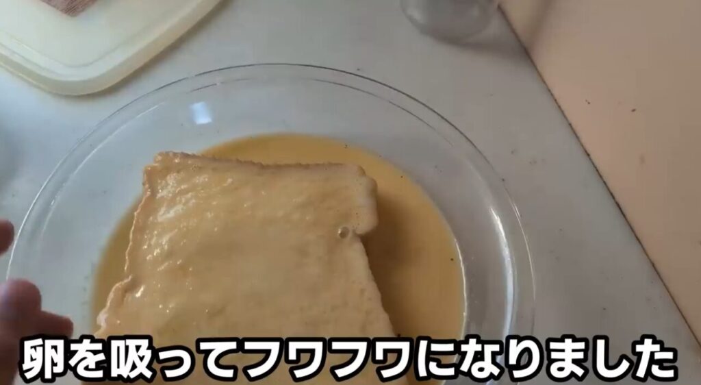 パンを卵液にひたして、レンジで1分温めて硬いパンを生まれ変わらせます。