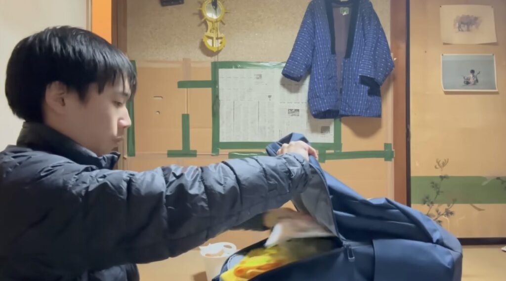 休日の朝は、おばあちゃんに挨拶をしてストーブで部屋を暖めます。