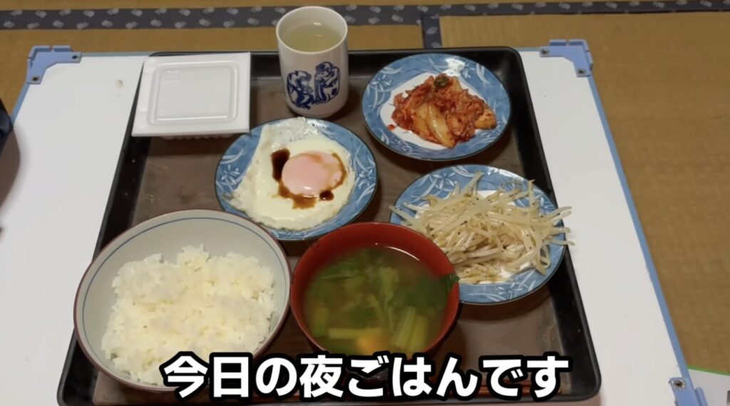 半熟の目玉焼きには醤油をかけ、キムチ納豆でご飯が進みます。