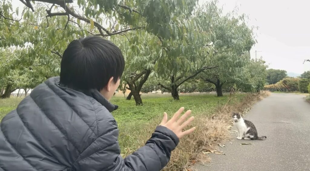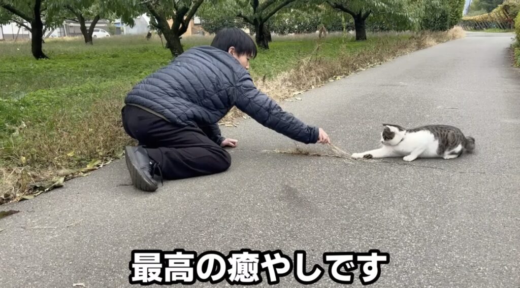 途中で近所の飼い猫に出会い、草をおもちゃにして一緒に遊びます。